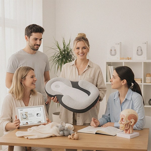 Also entstand Kidlo. Ein orthopädisches Babybett, das die natürliche Kopfform schützt, die Verdauung unterstützt und Babys geborgen schlafen lässt – egal wo.